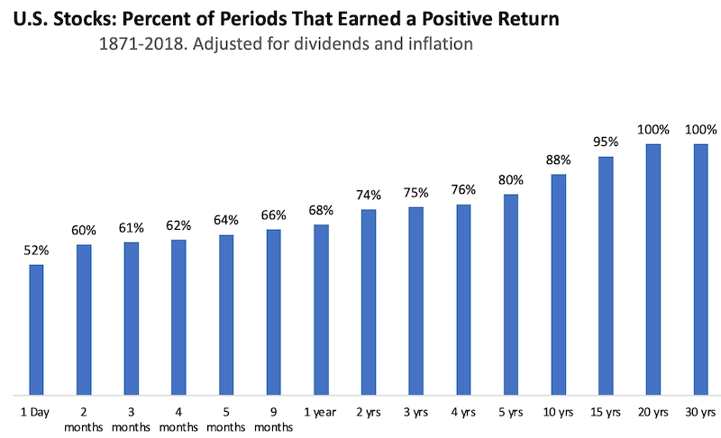 Kurzfristig ist der Aktienmarkt unberechnbar. Die Rendite schwankt von Jahr zu Jahr enorm. Je länger ich meine ETFs halte, desto ausgeglichener und vorhersehbarer werden die Renditen.